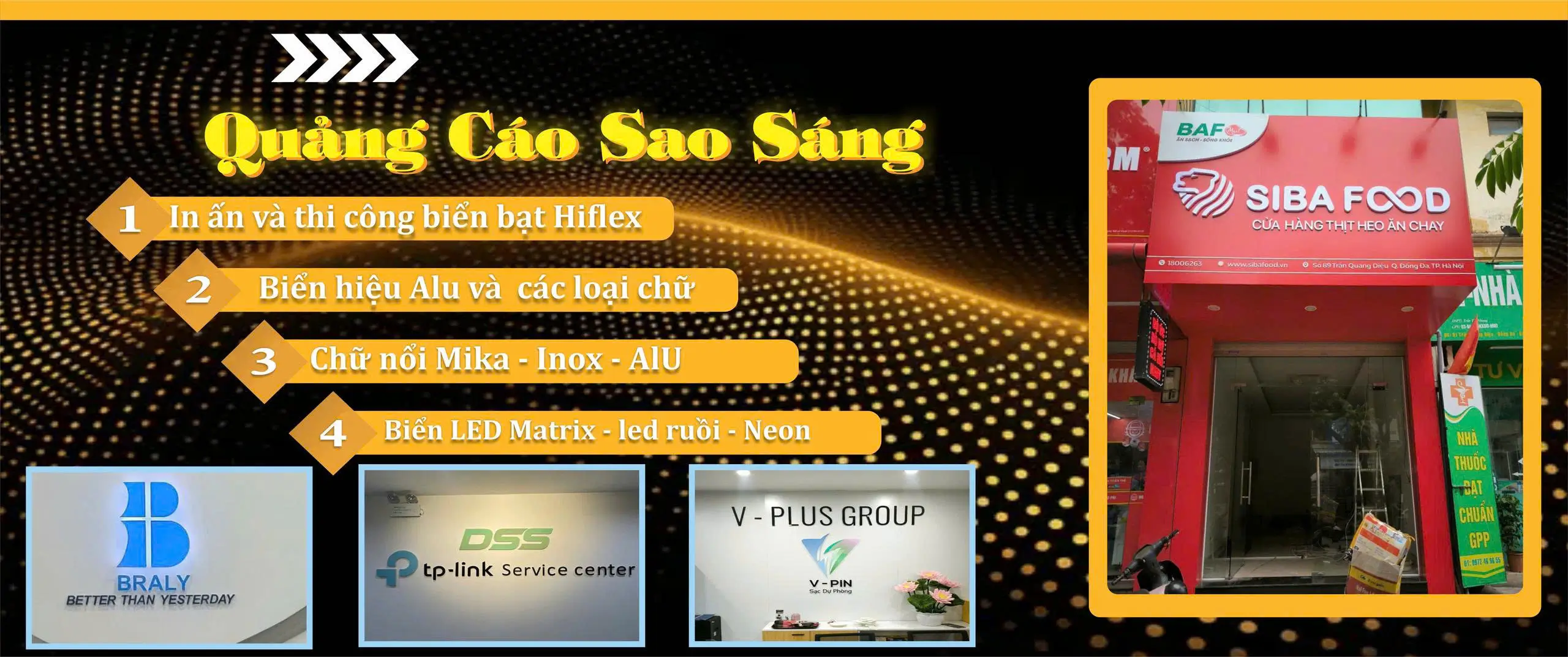 Công ty Quảng Cáo Sao Sáng là đơn vị chuyên thiết kế, thi công và lắp đặt biển hiệu quảng cáo chuyên nghiệp hàng đầu tại TP.Hà Nội và các tỉnh thành lân cận. Với hơn 10 năm kinh nghiệm trong ngành, chúng tôi tự hào mang đến cho khách hàng giải pháp quảng cáo hiệu quả – thẩm mỹ – tiết kiệm chi phí, góp phần nâng tầm hình ảnh thương hiệu và gia tăng doanh số bán hàng.