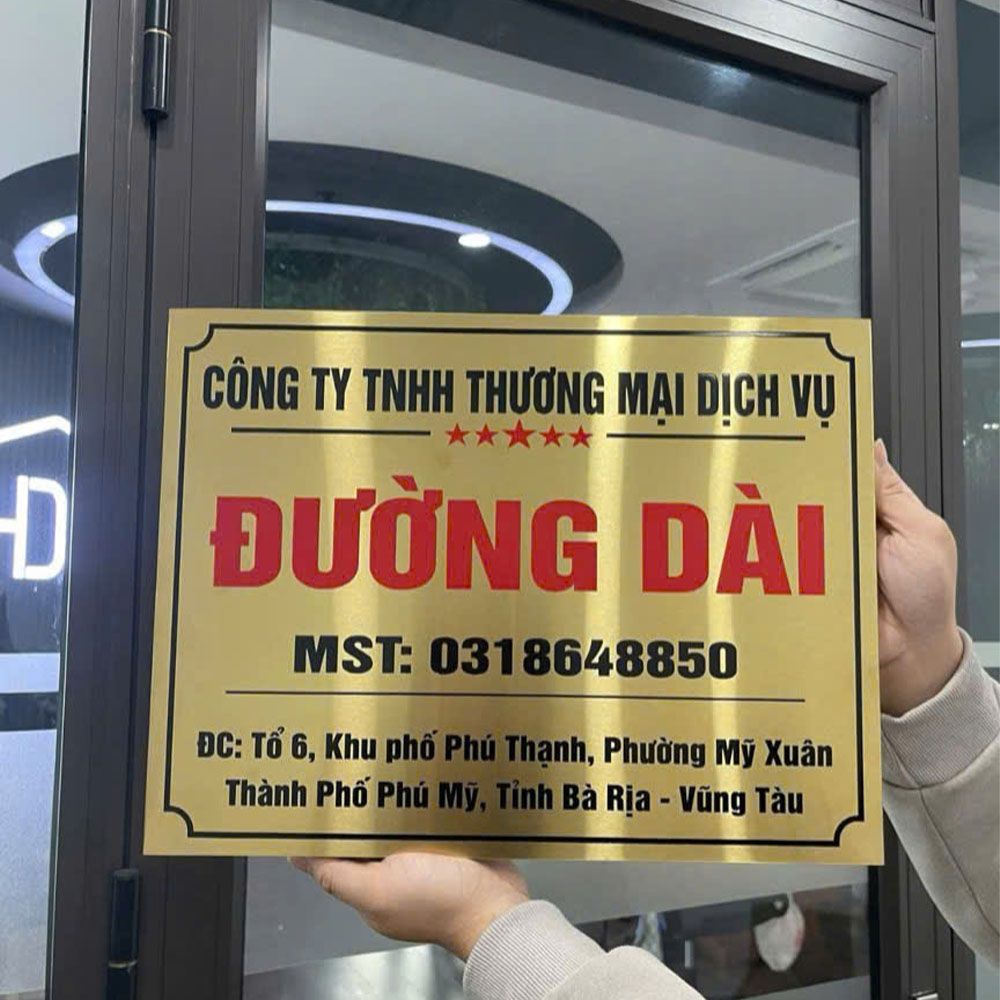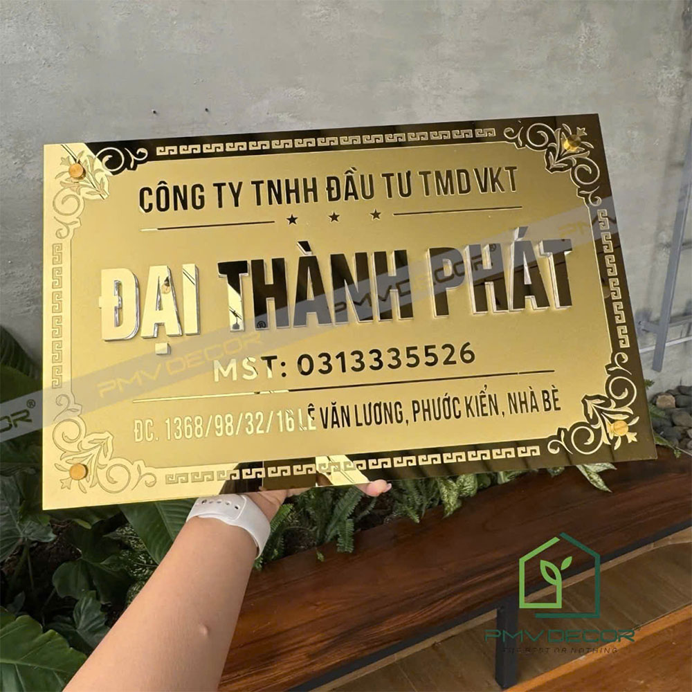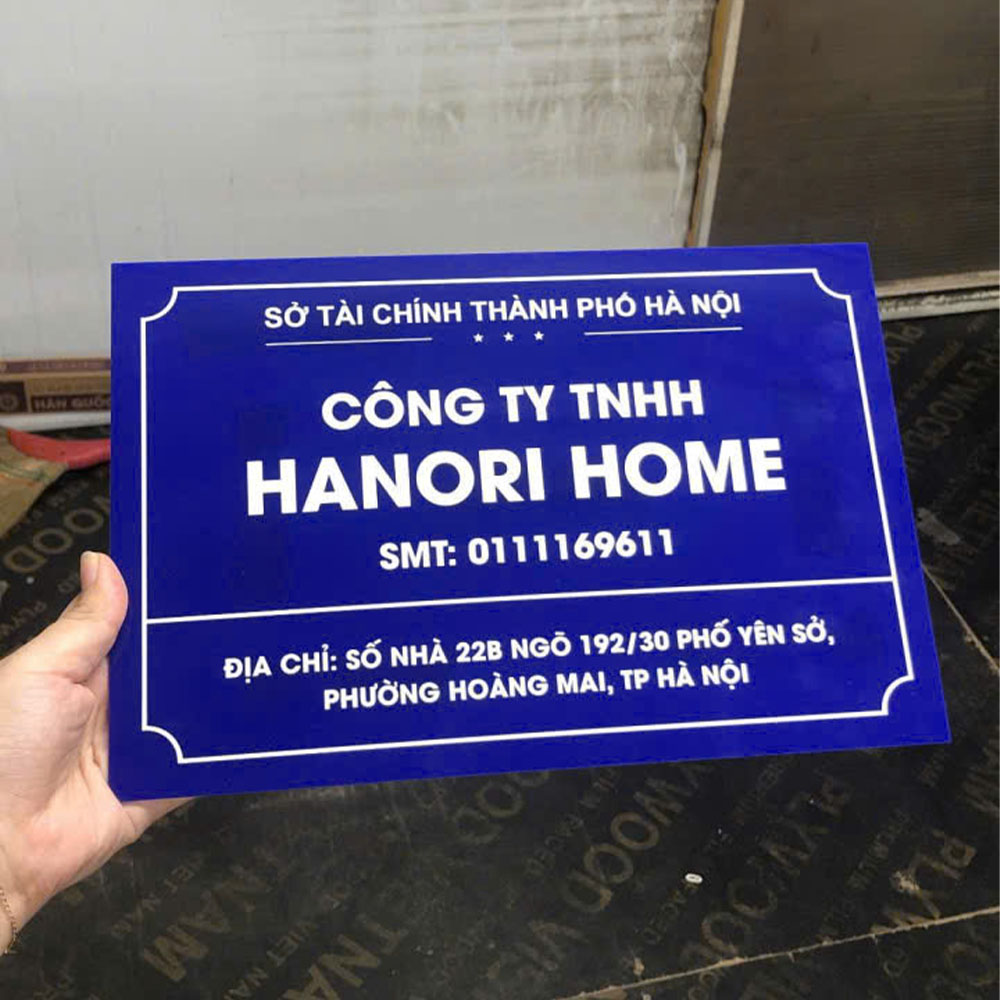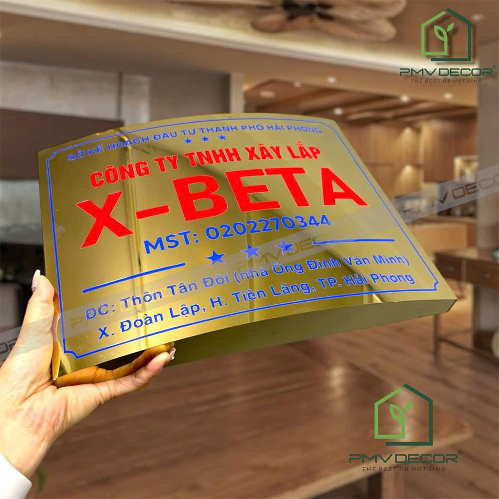 Biển công ty mica được ưa chuộng nhờ giá thành rẻ, thẩm mỹ cao và dễ thi công. Mica có độ bóng mịn, màu sắc đa dạng, có thể kết hợp in UV, dán decal hoặc khắc chữ nổi để tăng độ sang trọng. Loại biển này phù hợp cho văn phòng, công ty khởi nghiệp hoặc tòa nhà văn phòng hiện đại.
